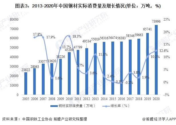 先看一下下圖圖表3,可以看到有幾年時(shí)間(2014-2018年)中國鋼材的實(shí)際消費(fèi)量幾乎沒有增長,而這幾年也是螺紋鋼鋼價(jià)下跌的幾年,在這幾年中不少鋼鐵企業(yè)出現(xiàn)了倒閉。所以可以分析發(fā)現(xiàn),螺紋鋼鋼價(jià)與實(shí)際消費(fèi)量有直接的關(guān)系,也就是供需關(guān)系是決定螺紋鋼鋼價(jià)調(diào)整周期的重要規(guī)律。