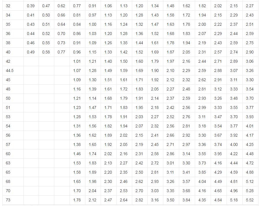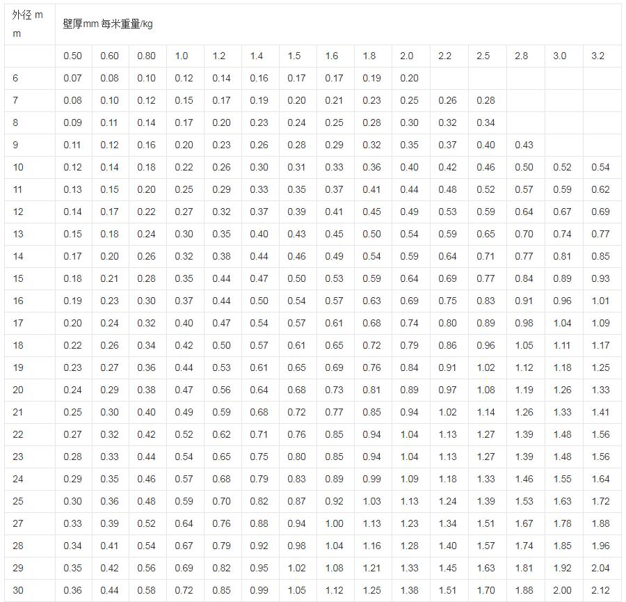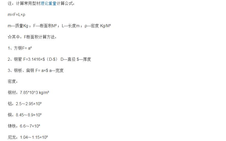 在這個(gè)重量表中,它是作為一個(gè)參數(shù)表存在的,方便我們進(jìn)行實(shí)際質(zhì)量的計(jì)算,根據(jù)它的一些計(jì)算公式,然后采取表中的數(shù)值進(jìn)行計(jì)算。具體公式為:m=F×L×ρ,m—質(zhì)量Kg ;F—斷面積M² ;L—長度m ;ρ—密度 Kg/M³