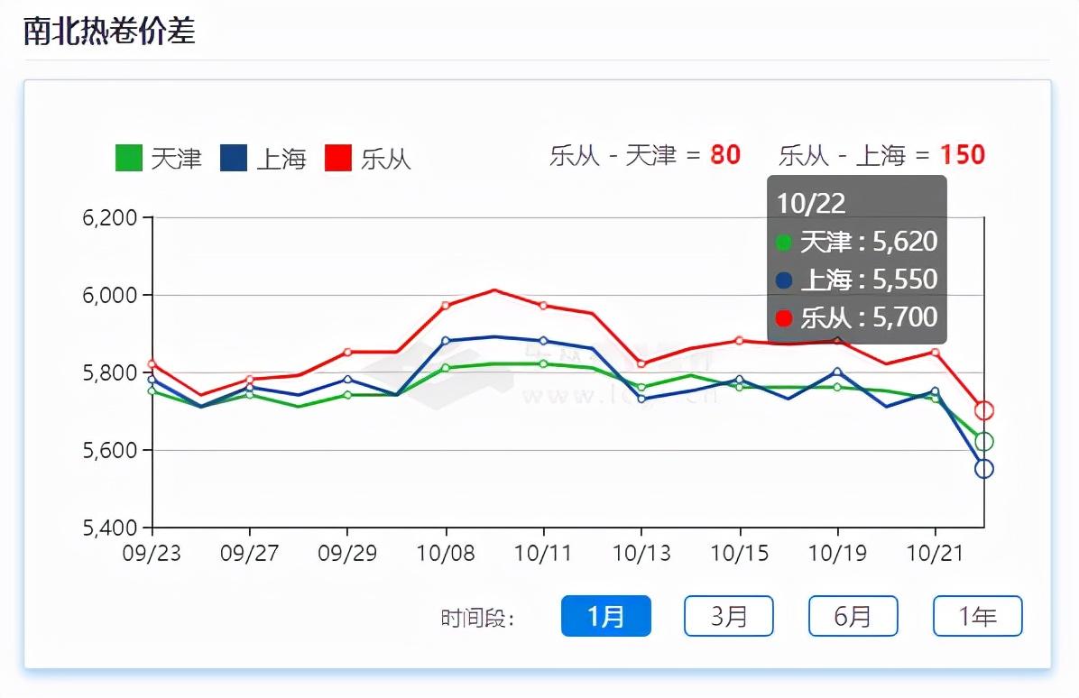 10月22日,樂從市場熱卷主流價位報5700元/噸,較前一交易日跌150元/噸,較天津熱卷價格高80元/噸;較上海熱卷價格高150元/噸。從南北價差來看,較前一交易日有所縮小,北材南下利潤關閉。