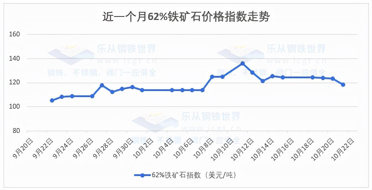 截至10月21日,普氏62%鐵礦石指數(shù)報118.3美元/噸,較前一交易日跌5.05美元/噸,月均值為118.83美元/噸 。