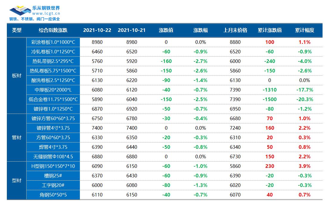 在10月21日發(fā)改委發(fā)布,全力做好大宗商品保供穩(wěn)價工作,江蘇鋼坯下調(diào)320,25家鋼廠中占比40%下調(diào)10-100元/噸,期螺連日跌停,大跳水殺跌433, 市場悲觀情緒加重,樂從鋼價跟隨下調(diào),市場猶豫天氣一樣冷,終端目前維持按需采購,整體成交較昨日回落。進貨方面,在限產(chǎn)、限電從嚴,壓減粗鋼產(chǎn)量基調(diào)未變,隨著鋼價格回落,南北價差逐步放大,北貨南調(diào)有利可圖,加之部分客戶有抄底意向,鋼鐵世界進貨量略有回升。