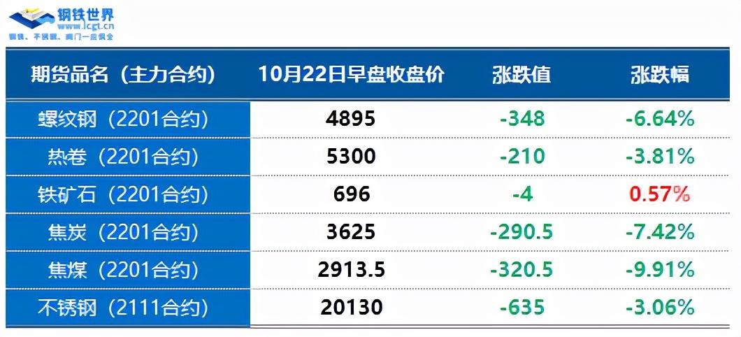 截止10月22日早上收盤,國內(nèi)黑色系期貨以跌勢為主,其中螺紋鋼主力合約跌6.64%;熱卷主力合約跌3.81%;焦炭期貨走勢回落,跌7.42%;鐵礦石期貨走勢平穩(wěn),漲0.57%;焦煤期貨走勢下跌,跌9.91%,不銹鋼期貨走勢趨弱,跌3.06%。