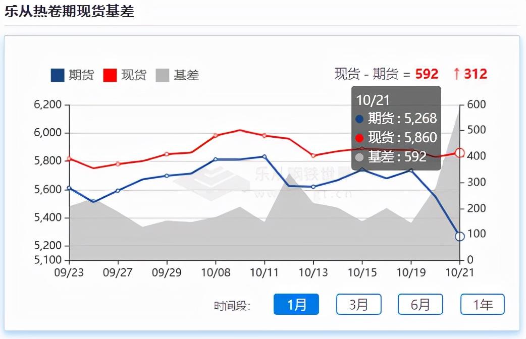 基差方面:10月21日,樂從熱軋卷現(xiàn)貨主流價格報5860元/噸,較前一交易日上漲30元;熱卷期貨2201主力合約價格收報5268元/噸,較前一交易日下跌282元/噸。本地熱卷期現(xiàn)基差592元,較前一交易擴大312元,近一個月基差均值為189.7元。