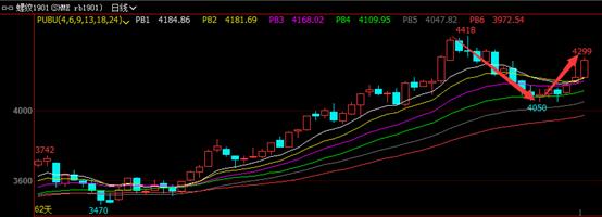 今日螺紋鋼期貨1901主力合約開盤后直線沖高至日內(nèi)最高位4299,隨后在2450線上震蕩運(yùn)行,最終收?qǐng)?bào)于4284元,較上一日結(jié)算價(jià)格上漲1.76%。從日線走勢(shì)來(lái)看,期螺走出一輪高位回調(diào)反彈的行情。