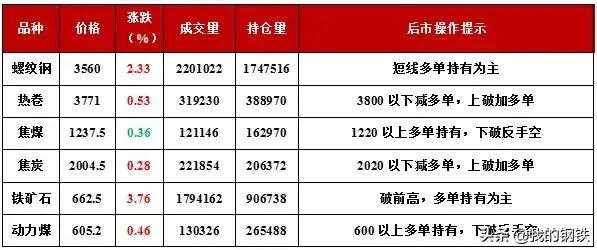 國內(nèi)商品期貨多數(shù)收漲,鐵礦收漲3.8%,原油收漲2.4%,瀝青、豆粕、菜粕、螺紋、鄭醇、線材漲逾1%,塑料、玉米、熱卷、滬鎳、白糖、鄭煤、棉紗、橡膠、焦炭、滬錫、鄭棉、雞蛋等收漲。PTA收跌1.4%,錳硅、滬鋅、焦煤、滬鉛、硅鐵、滬金、滬鋁等收跌。國內(nèi)期貨主力合約行情&后市操作提示(截至當日15:00):