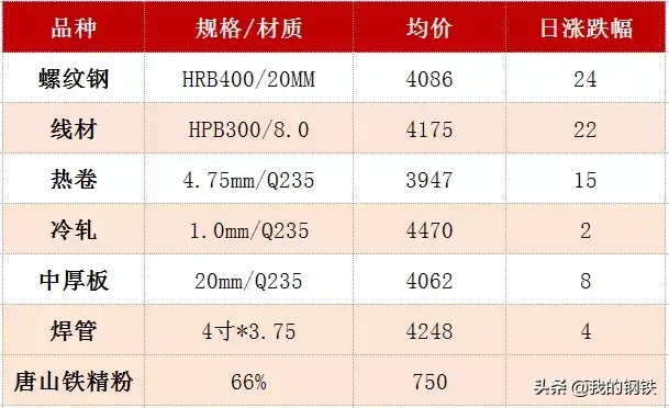 2、螺紋鋼價格上調(diào)30元/噸,Ф18-25mmHRB400E螺紋出廠價格調(diào)整為4240元/噸;