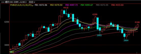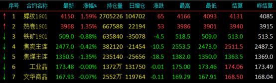 今日螺紋鋼期貨1901主力合約穩(wěn)打穩(wěn)扎,一路震蕩上漲。全天最高4166元,最低4093元,收于4150元,較上一日結(jié)算價(jià)格上漲65元,漲幅1.59%。
