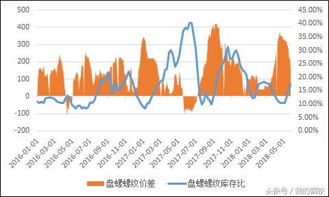 因京津冀區(qū)域鋼廠生產(chǎn)盤(pán)螺的力度加大以及外來(lái)盤(pán)螺資源的借機(jī)流入,促使京津冀市場(chǎng)近期出現(xiàn)盤(pán)螺庫(kù)存消化速度減慢甚至出現(xiàn)增加的情況。從上圖可以看出,市場(chǎng)盤(pán)螺、螺紋的價(jià)差與盤(pán)螺、螺紋鋼的庫(kù)存比呈反相關(guān),即隨著近期盤(pán)螺庫(kù)存占比增加,盤(pán)螺、螺紋價(jià)差有所縮小。從2016年至今,北京市場(chǎng)盤(pán)螺、螺紋鋼的平均價(jià)差為144元/噸,盤(pán)螺庫(kù)存量占螺紋庫(kù)存量的比例為17.3%。截至目前,盤(pán)螺占螺紋庫(kù)存比為17.6%,盤(pán)螺、螺紋鋼價(jià)差為170元/噸,因此在盤(pán)螺庫(kù)存占比高于平均水平的情況下,短期內(nèi)盤(pán)螺、螺紋的價(jià)差將會(huì)進(jìn)一步收窄。