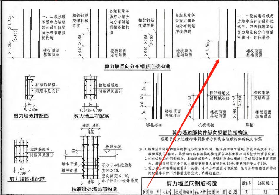 剪力墻豎向鋼筋,一二級抗震非底部加強部位或三四級抗震情況下只能按照1.2lae綁扎搭接,這里一定要注意是lae錨固長度不是Ll綁扎搭接長度。在實際施工過程中,鋼筋班組為滿足外露長度會加長下料長度,對于此節(jié)點來講,是嚴重的超長浪費。