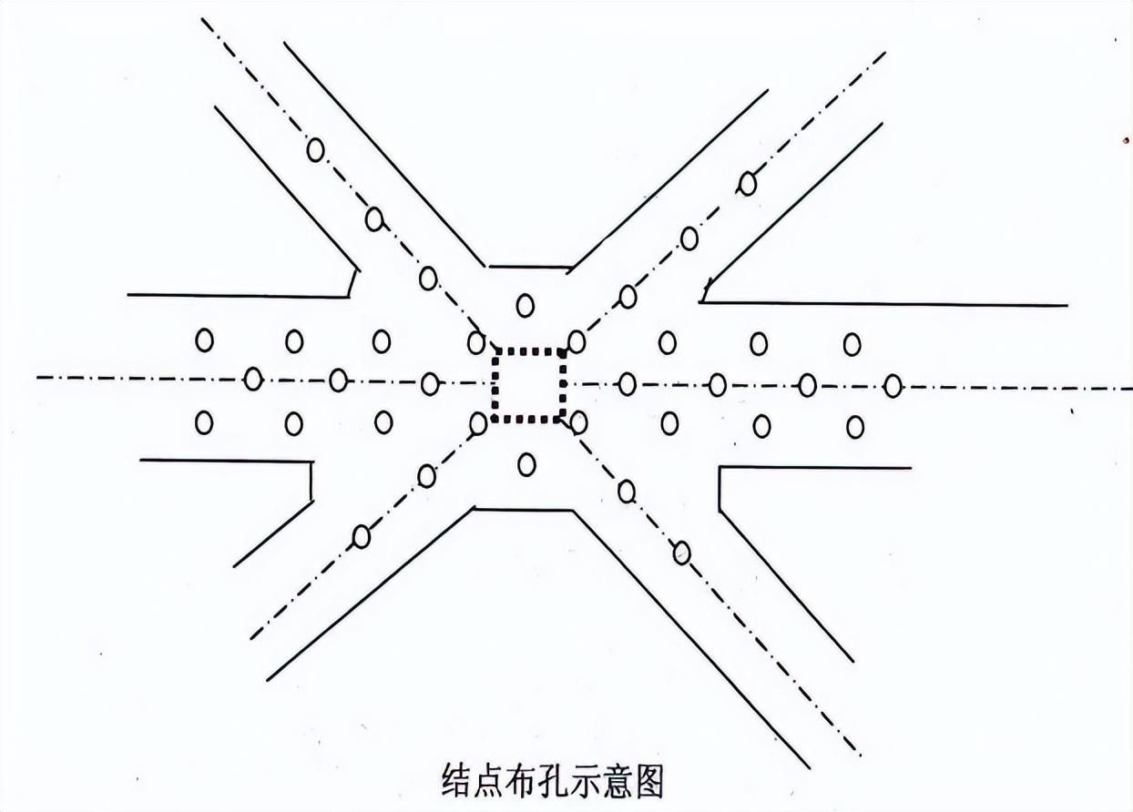 炮孔成孔方式有兩種:一是采用預(yù)埋孔,即在支撐澆搗時插入PVC管,爆破前清孔,不合格的進行補孔;另外一種是在支撐爆破前人工打孔(見圖5.2.1)。前者施工進度快、不影響基坑內(nèi)其他施工作業(yè)等優(yōu)點,故已在支撐爆破作業(yè)中廣泛推廣,布孔時采用梅花形布孔。