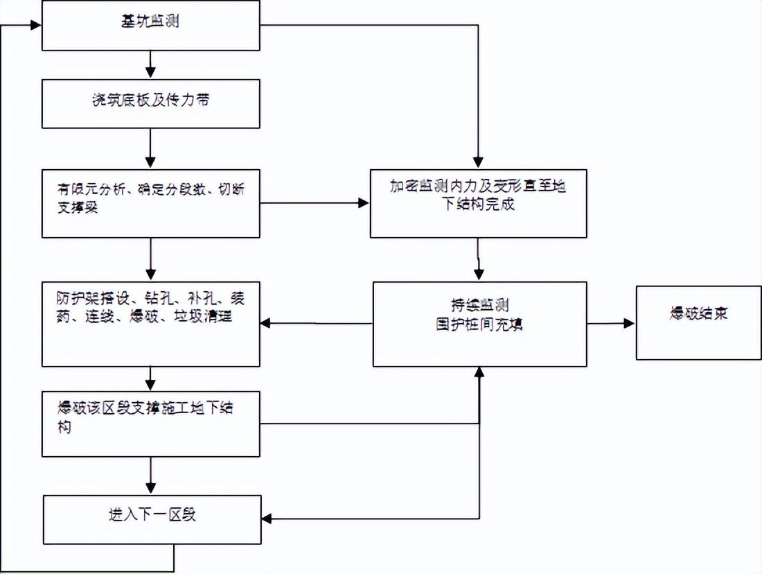 支撐施工預(yù)埋孔→持續(xù)基坑監(jiān)測→澆筑混凝土底板及傳力帶→利用空間有限元分析→確定分段數(shù)→斷開需爆破拆除和暫不拆除的部位→爆破防護架搭設(shè)→確定藥量、裝藥、填塞、網(wǎng)絡(luò)引線、爆破(加密監(jiān)測)、清理垃圾→施工該區(qū)域結(jié)構(gòu)→爆破拆除其他區(qū)域內(nèi)支撐→施工該區(qū)域結(jié)構(gòu)→基坑監(jiān)測。如圖5.1。