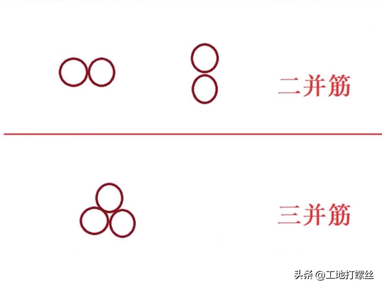 并筋后的有效鋼筋直徑,兩根并筋是1.41倍單根鋼筋直徑,三并筋等效直徑是1.73倍單根鋼筋直徑。二并筋可按橫向、縱向鋼筋方式布置,三并筋按品字型布置。