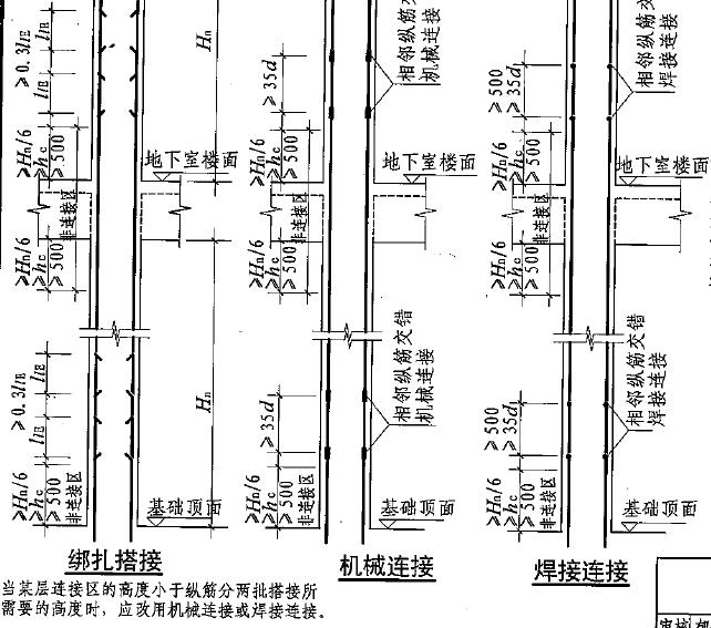 外圍及內側剪力墻擋土墻,截面變小時。采取兩種方案,當為截面寬度變小50mm之內時,鋼筋彎折1/6的比例。外側鋼筋盡量能通則通,如接頭盡量在上部位置鋼筋處、搭接、絲接、焊接。