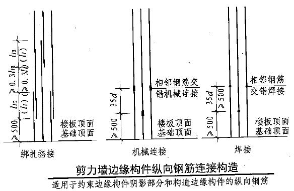 同構件同區(qū)段內的鋼筋接頭的數(shù)量,以及綁扎接頭的搭接長度必須符合規(guī)范規(guī)定和設計要求。設計無要求時采用如下原則:剪力墻豎向鋼筋采用100%連接,滿足1.2倍的錨固長度。接頭中心為0.6Lae.標準層剪力墻構造邊緣柱、約束柱、轉角柱、端柱、暗柱、翼柱等,嚴格按照11G101-1施工,接頭百分率50%,接頭錯開500mm與35d的較大值。具體如下圖所示,接頭位置距地大于等于500mm。梁原則上盡量不留接頭,接頭百分率宜為25%,如采用一級直螺紋接頭連接,可為50%,其接頭位置不限。其余為底部筋在支座處連接、上部筋在跨中1\3處連接。板搭接百分率為25%,如采用機械連接的接頭則為50%。