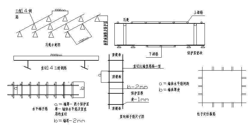c、單層鋼筋網片墻:為保證支模板時鋼筋網片居墻中,在鋼筋網片上焊短鋼筋,起限位作用(注意鋼筋盡量焊在水平筋上),間距1000mm左右。