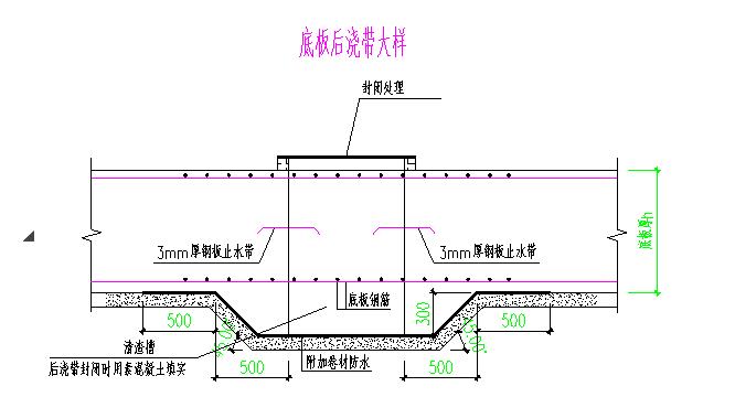 基礎底板外墻應一次澆筑高出底板300mm并設置施工縫,外墻水平施工縫內設置止水條;A底板及外墻后澆帶設置止水鋼板,開口朝下、朝外,尺寸為300mm*3mm。綁完底皮筋后進行止水鋼板的安放工作,焊接支撐腿,綁扎密封鋼絲網。然后止水鋼板拉線調直焊接固定。然后再上部焊接帶網支腿,滿足保護層要求。后澆帶完畢后,采用木板在其上部密封固定。防止雜物進入,難以清理。后澆帶待兩側砼澆筑滿足2個月后進行澆注。后做專項方案。做法如下圖: