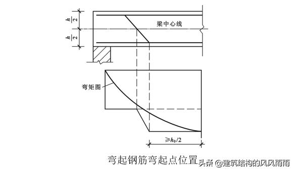 在梁的受拉區(qū)中,彎起鋼筋的彎起點,可在按正截面受彎承載力計算不需要該鋼筋截面面積之前彎起;但彎起鋼筋與梁中心線的交點,應(yīng)在不需要該鋼筋的截面之外;同時,彎起點與按計算充分利用該鋼筋的截面之間的距離,不應(yīng)小于h0/2。