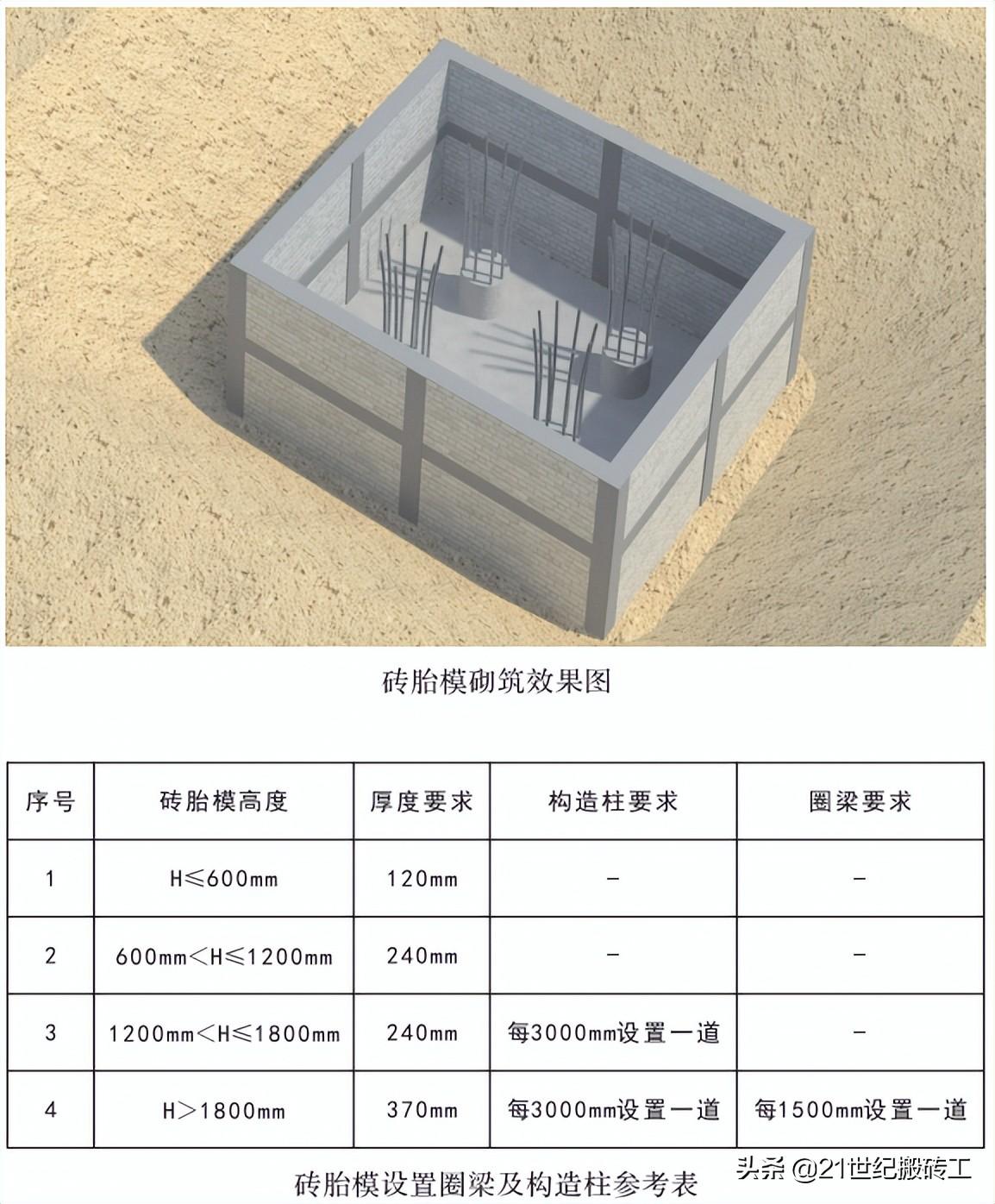 1.磚胎模施工前必須結(jié)合土質(zhì)情況編制針對(duì)性施工方案,并根據(jù)磚胎模砌筑長(zhǎng)度和高度設(shè)置構(gòu)造柱及圈梁。