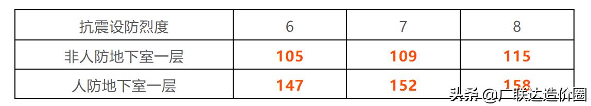 一層非人防地下室或人防地下室鋼筋含量分別在105~115kg/㎡、147~158kg/㎡波動;在抗震設(shè)防烈度相同的情況下,人防地下室比非人防地下室鋼筋含量高約40kg/㎡。另外,非人防地下室或人防地下室鋼筋含量均隨著抗震設(shè)防烈度的增加而增大,增幅在5kg/㎡左右。