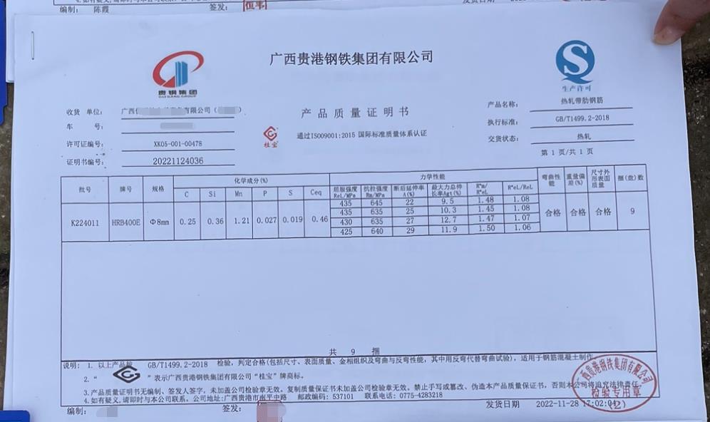 3、核對質量證明文件和每捆鋼筋掛牌上標明的廠家名稱、產(chǎn)品名稱、鋼筋級別(牌號)、規(guī)格、爐批號是否一致。核對質量證明文件發(fā)貨日期是否在掛牌上的生產(chǎn)日期之后。
