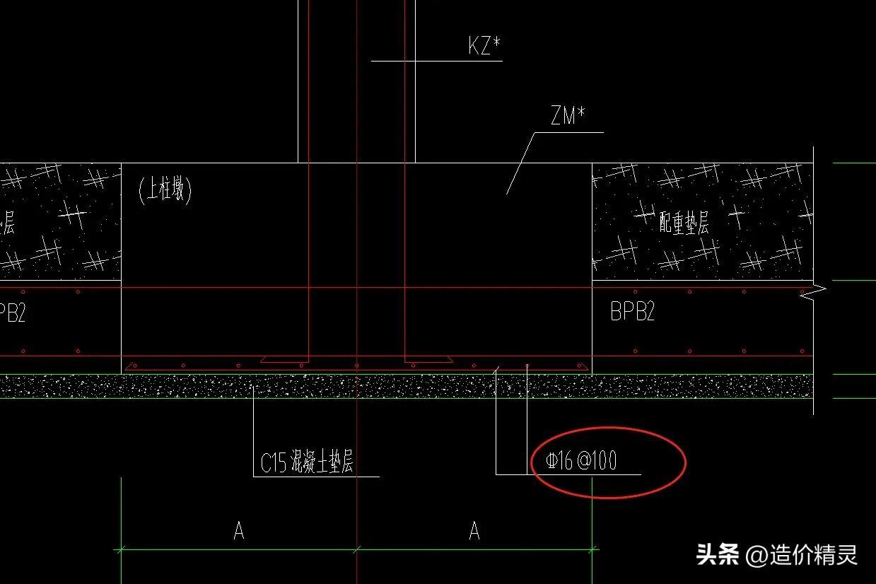 下圖是柱基礎(chǔ)與地下室筏板基礎(chǔ)連接的詳圖和柱基礎(chǔ)的鋼筋布置情況!我們可以看見(jiàn)柱基礎(chǔ)位于墊層上,底部鋼筋布置是單層雙向,鋼筋等級(jí)是四級(jí)鋼、直徑是16mm、布置間距是100mm!四周與筏板基礎(chǔ)連接!
