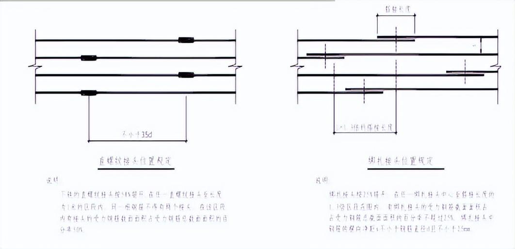 10.2搭接接頭相臨兩接頭應(yīng)錯(cuò)開(kāi)1.3L(L為搭接長(zhǎng)度);鐓粗直螺紋套筒連接的接頭位置應(yīng)錯(cuò)開(kāi)35d(Φ25為875mm,Φ22為770mm)。