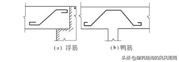 3、 當(dāng)不能將縱筋彎起而需單獨(dú)為抗剪要求設(shè)置彎筋時(shí),應(yīng)將彎筋兩端錨固在受壓區(qū)內(nèi)(俗稱鴨筋)。彎起鋼筋不得采用浮筋。