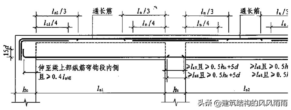 邊支座為固定支座,下部縱向鋼筋的錨固長(zhǎng)度與中間支座相同;上部縱向鋼筋伸人支座內(nèi)長(zhǎng)度不小于la,當(dāng)水平長(zhǎng)度不夠時(shí),可向下彎折15d(d為縱向受力鋼筋直徑),且彎折前的水平段不小于0.4la。