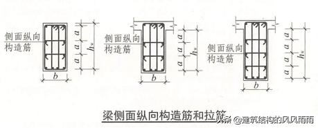 當(dāng)梁的腹板高度hw≥450mm時(shí),在梁的兩側(cè)面沿高度配置縱向構(gòu)造鋼筋(腰筋),每側(cè)縱向構(gòu)造鋼筋(不包括梁上、下受力鋼筋及架立鋼筋)截面面積不小于腹板截面面積bhw的0.1%,間距不宜大于200mm,直徑為8~14mm,并用拉結(jié)鋼筋連接;拉結(jié)鋼筋直徑與箍筋相同,間距為箍筋間距的兩倍。薄腹梁在下部再加密一倍。