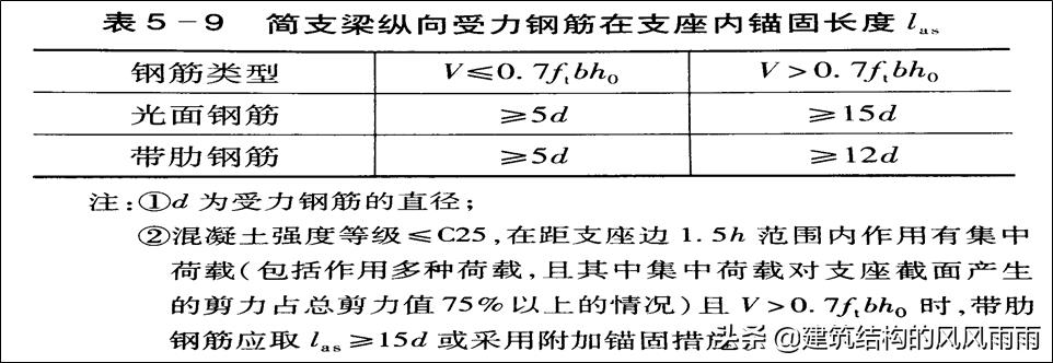 ① 當(dāng)計(jì)算中不利用其強(qiáng)度時(shí)(此時(shí)支座受正彎矩作用),對(duì)光面鋼筋取Las≥15d,對(duì)帶肋鋼筋取Las≥12d;且鋼筋伸至支座中心線。