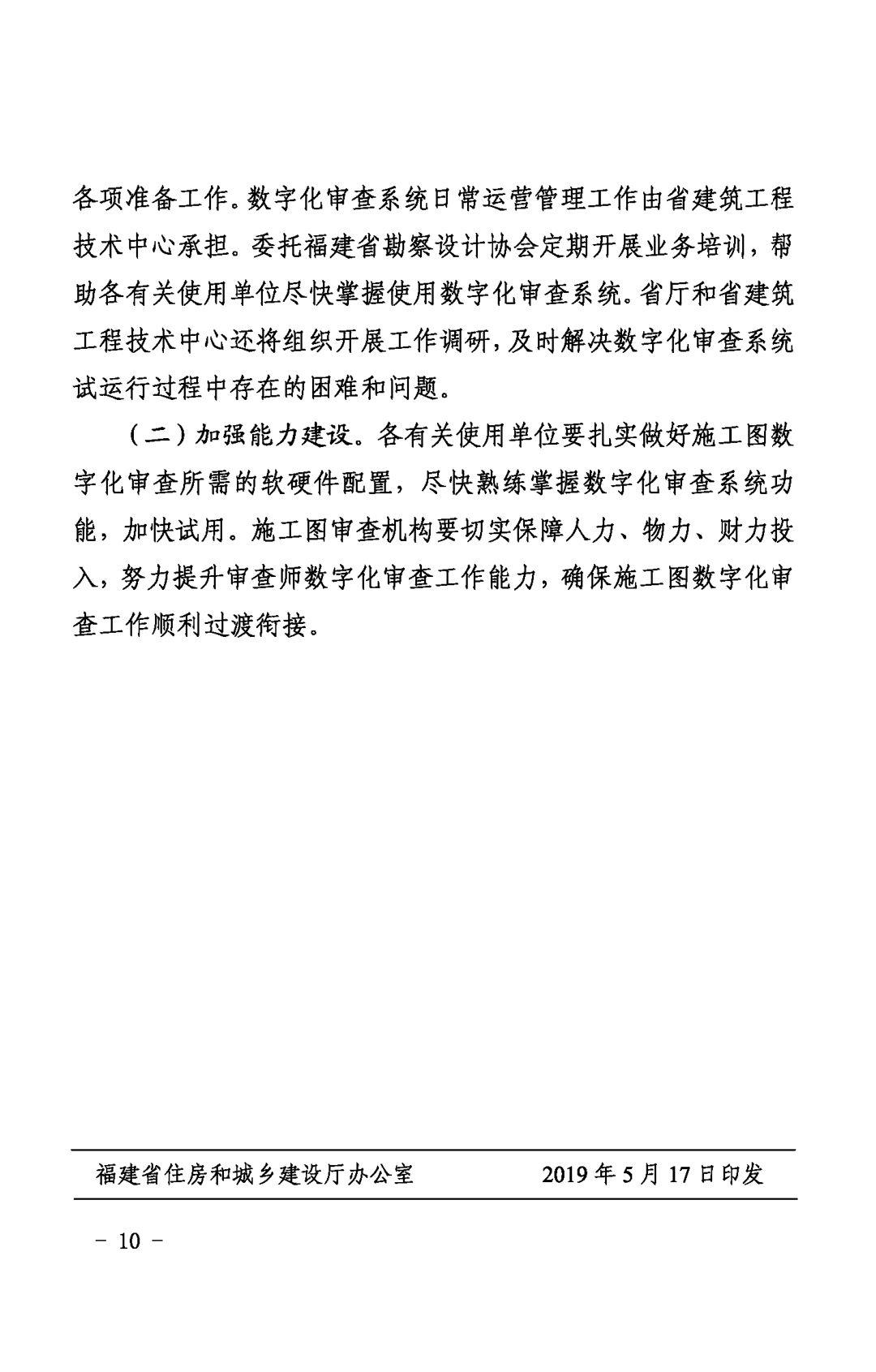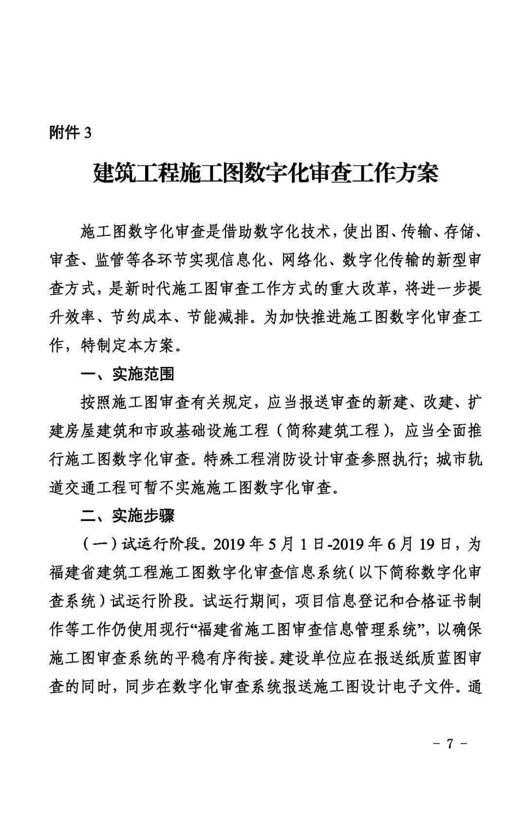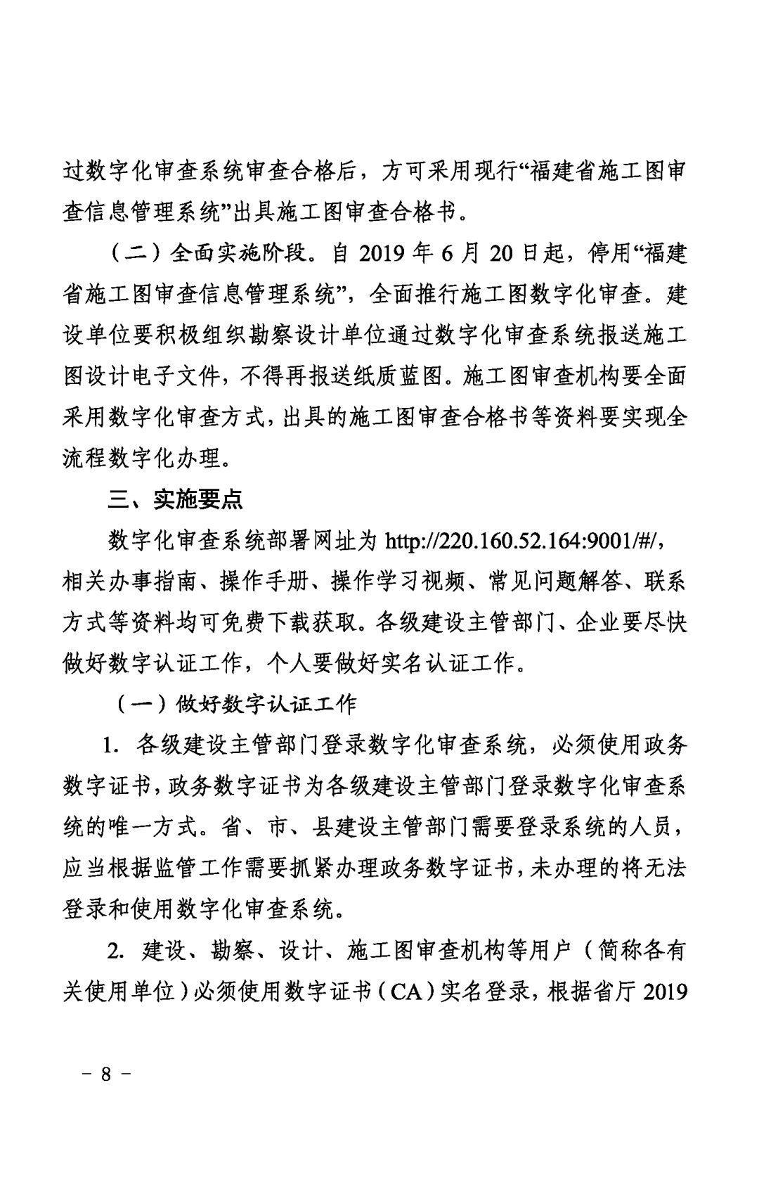 自2019年6月20日起,停用“福建省施工圖審查信息管理系統(tǒng)”,全面推行施工圖數(shù)字化審查。建設(shè)單位要積極組織勘察設(shè)計單位通過數(shù)字化審查系統(tǒng)報送施工圖設(shè)計電子文件,不得再報送紙質(zhì)藍(lán)圖。