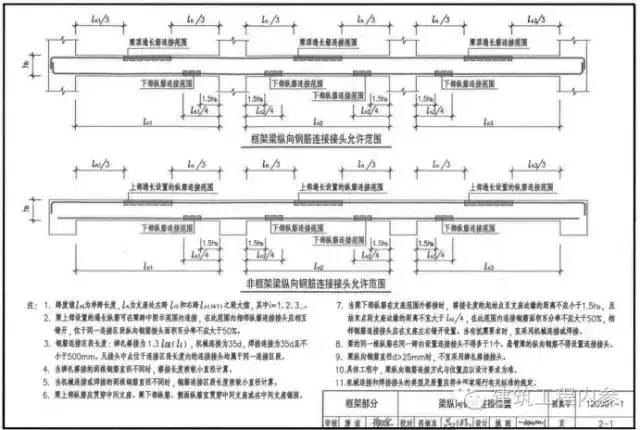 規(guī)范【11G101-1圖集(55頁(yè))】規(guī)定:縱向受力鋼筋連接位置宜避開(kāi)梁端、柱端、箍筋加密區(qū),如必須在此連接時(shí),應(yīng)采用機(jī)械連接或焊接,接頭位置應(yīng)符合鋼筋混凝土施工規(guī)范規(guī)定。接頭位置詳見(jiàn)下圖【12G901-1圖集(2-1頁(yè))】 。