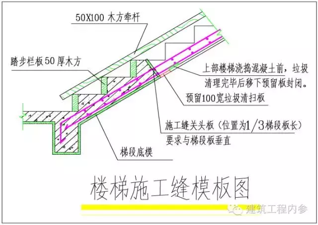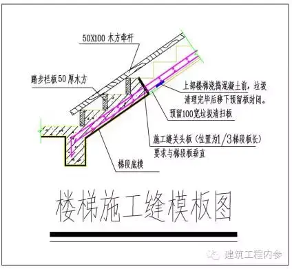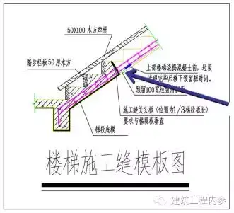 規(guī)范【GB50204-2002第7.4.5條 】規(guī)定 :確定施工縫位置的原則為:盡可能留置在受剪力較小的部位。樓梯施工縫一般留置在Ln/3(Ln梯段凈跨)處,即約第三個(gè)踏步處。