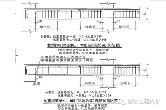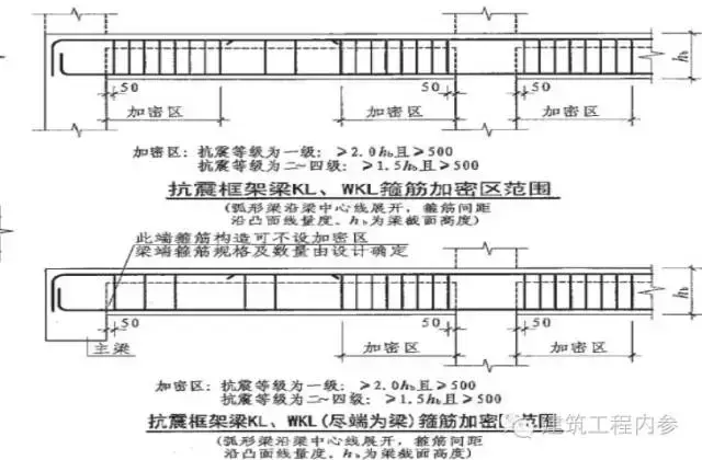 【11G101-1圖集(85頁(yè))】規(guī)定:抗震框架梁箍筋加密區(qū)范圍規(guī)定:抗震等級(jí)為一級(jí): ≥2.0hb ≥500;抗震等級(jí)為二~四級(jí): ≥1.5hb ≥500;(hb為梁截面高度)