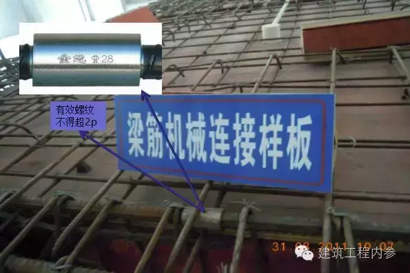 規(guī)范【JGJ2003-2004第6.3.3條】規(guī)定:鋼筋連接完畢后,標(biāo)準(zhǔn)型接頭連接套筒外應(yīng)有外露有效螺紋。且連接套筒單邊外露有效螺紋不得超2p(p-螺紋螺距)。