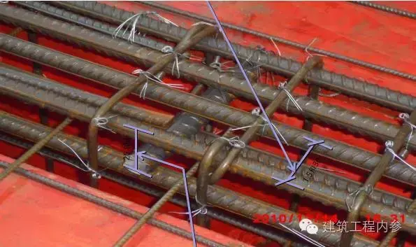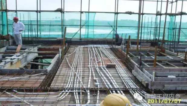規(guī)范【 GB50303-2002第14.2.6 及第3.3.11 條】規(guī)定 :暗配的導(dǎo)管的埋設(shè)深度與建筑物、構(gòu)筑物表面的距離不應(yīng)小于15mm,應(yīng)排列整齊,固定點(diǎn)間距均勻,在底層鋼筋綁扎完成,上層鋼筋未綁扎前敷設(shè),且檢查確認(rèn),才能綁扎上層鋼筋和澆搗混凝土。