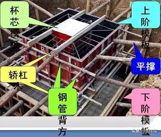 杯芯模兩側(cè)要釘上轎杠木,以便擱置在上臺階模板上,杯芯模不設(shè)底模板,以利杯口底部砼振搗。